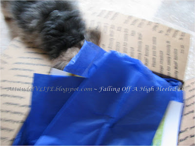 I love that wrapping paper on the box, so cute! And the box is just the right size for Dolce.